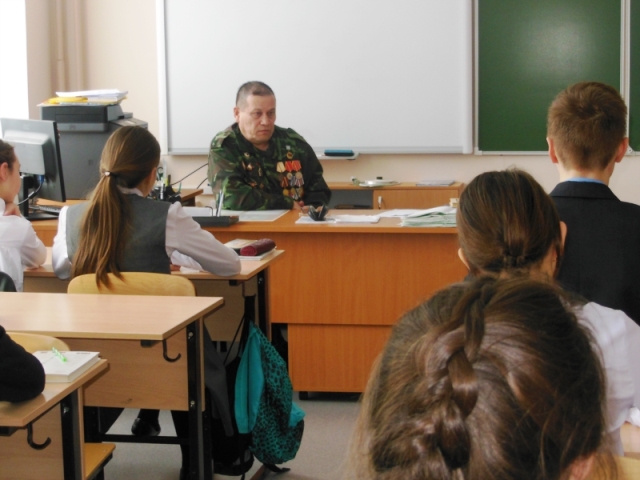 В начале встречи она рассказала нам о приближающемся дне памяти воинов-интернационалистов, о том, что миллионы солдат и офицеров побывали за 9 лет на войне в Афганистане, из них 190 цивилян. Затем выступил ветеран боевых действий Станислав Мордвинов. Он рассказал учащимся историю службы в Афганистане, вспоминал свой первый бой, службу в 5 мотострелковой дивизии, помощь афганскому народу. Ребята задали ветерану боевых действий немало интересных вопросов.